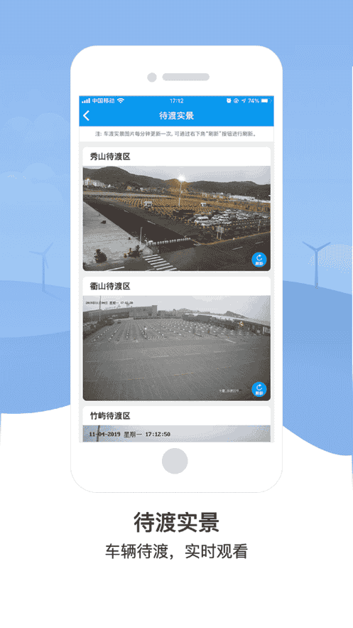 實(shí)時(shí)在線觀看:用戶可在線觀看秀山、衢山、竹嶼等車(chē)輛待渡區(qū)實(shí)景實(shí)時(shí)畫(huà)面,掌握最新情況。