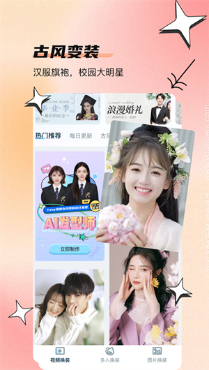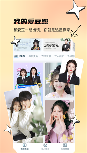 多樣換裝素材:提供古裝、旗袍、婚紗等海量風格,滿足你的各種造型需求。