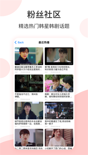 圈粉App,一款專為廣大韓迷粉絲打造的社區(qū)應(yīng)用。它匯聚了大量熱門明星,韓劇資訊,讓你隨時隨地關(guān)注喜愛的偶像和韓流資訊。這里有最新的韓流元素,一切你想要的,都在這里。