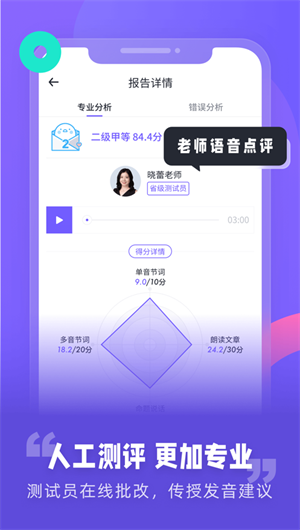 詳盡的發(fā)音報告:提供詳細(xì)的發(fā)音報告,讓用戶了解自己的發(fā)音情況。