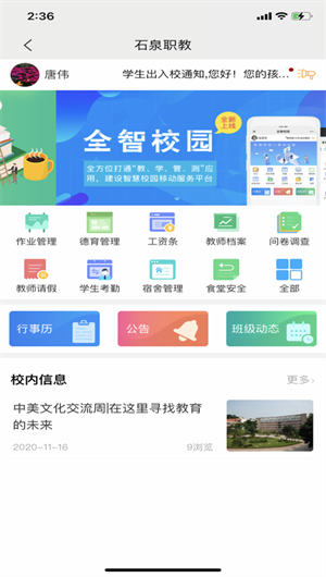校內信息一體化:此應用集成了各類校內信息,幫助教職工和學生及時了解校園動態。