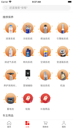 全面的產品分類:九大爺商城App具有全面的產品分類,涵蓋汽車后市場的所有需求,包括汽車配件、汽車裝飾、汽車維修等領域。
