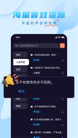 聲音特效庫:這款App擁有眾多內置的聲音特效,從戰斗的雷鳴,到森林的蟲鳴,無論你需要什么樣的聲音特效,音效大師都能滿足你。