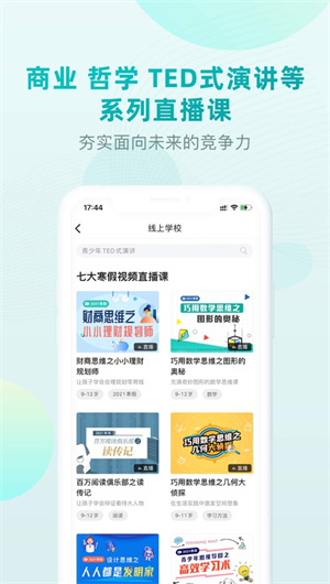 少年商學院 App適用于廣大7-16歲的青少年及其家長,無論是在校學生、即將升學或考慮留學的孩子,還是關心孩子全面發展的家長,都能在這一平臺上找到合適的教育資源和支持。
