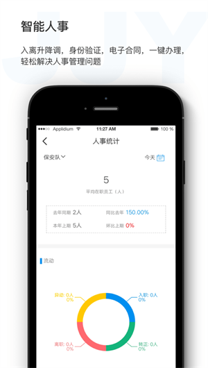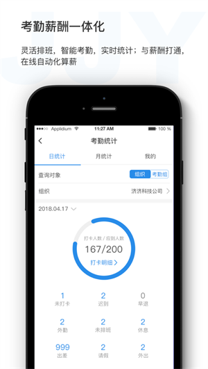 智能考勤:濟濟云App的智能考勤功能讓員工考勤變得更加簡便,無需任何硬件設備,只需手機即可完成考勤。