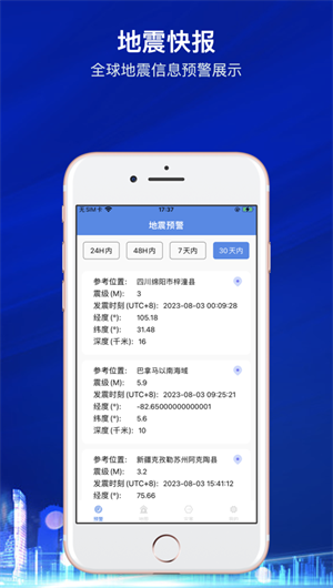 多時間段查詢:可以查詢不同時間段,如24小時、48小時、7天、30天的地震信息。