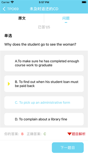 3、多樣化題型:除了TPO真題外,還有日常對話、新聞廣播等多樣題目,豐富你的聽力素材。